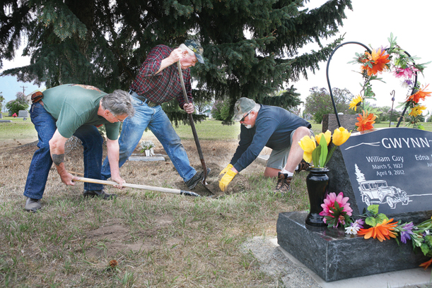 In preparation for Memorial Day weekend, local VFW veterans Steve Fehlberg, Russ Clark, and Gary Montgomery work alongside a passel of other veterans on Tuesday to install veteran grave stones for recently deceased veterans. Both VFW and American Legion volunteers install gravestones for veterans at area cemeteries, ensuring all are in place in time for Memorial and Veterans Days.